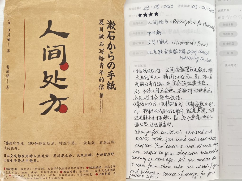 This week, I finished reading a book by a Japanese author on the interpretation of Natsume Soseki’s philosophy. It describes some of the difficulties that can be encountered in life and learning and how they are coped with. I have always believed in the saying “it is more important to learn how to learn well than to learn at all”. On the right hand side of the picture are some notes.This book is an intuitive combination of education and spiritual revelation that benefits both as a reader and as a creator.