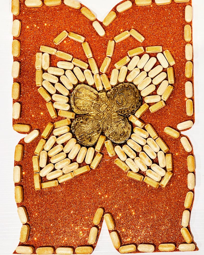 The A4 work I completed last week – Opposite of a Blue Butterfly. Because I wanted to heal in an artistic way, I used a pharmaceutical intervention in this orange piece