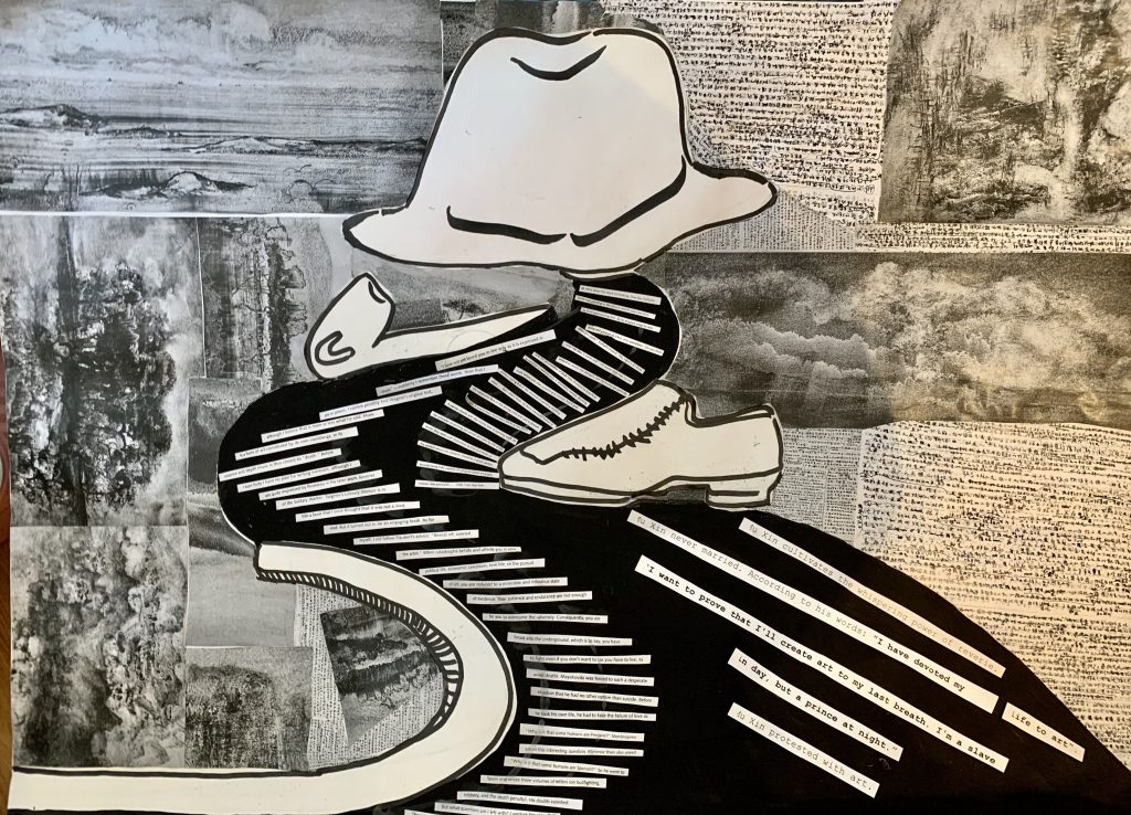 I have made related creations using him as a starting point: the collage pictured contains Mr. Mu Xin’s manuscripts and drawings, each sentence paving a long path to remain alone and to keep wandering. It seems that all that ever accompanied Mr. Mu Xin was a hat, a pair of leather shoes, a pipe and a walking stick. In modern terms perhaps: Minimalism, Zen, Wabi-Sabi.