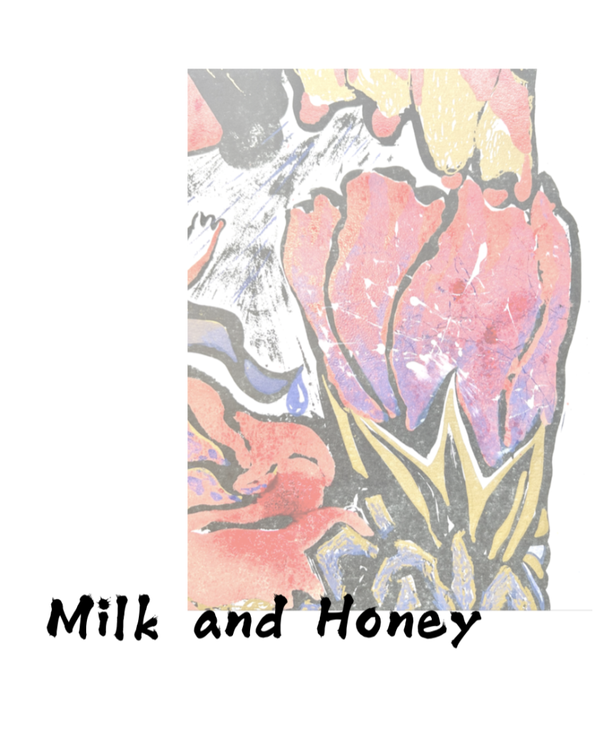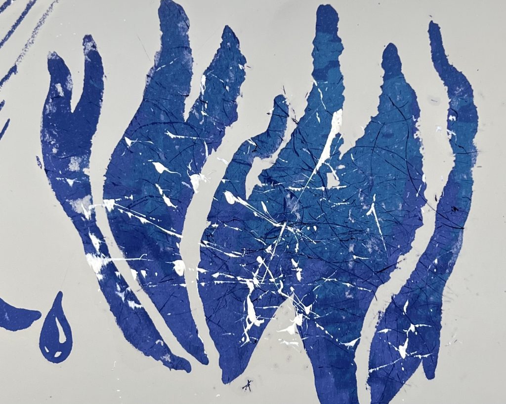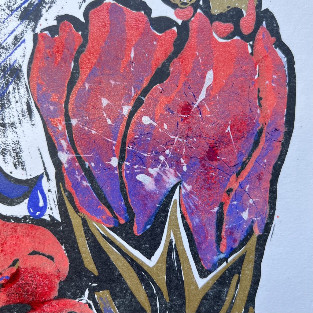 The piece is full of some elements of feminism, while in experimenting with different effects, I used the medium of hair, dipped in dark blue, light blue and white ink. When they were printed on the red tulips, which look painful and scarred, a wonderful mixture was created, giving birth to purple and reminding me of Pollock’s painting Enchanted forest. (right )